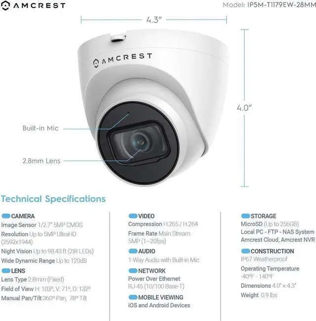 Starlight Illumination & Mic Stunning low-light 5MP performance with Starlight 1/2.7 image sensor and 5MP resolution (2592x1944). Super-wide 103° viewing angle allows you to cover more ground. This is a FIXED IP camera and Does Not Pan/Tilt. Built-in mic for one-way audio.