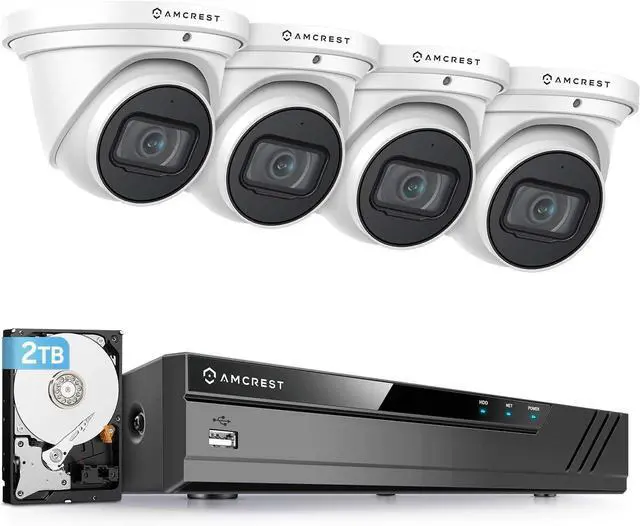 Amcrests NV4108E-A2 NVR comes with a Pre-Installed 2TB Seagate SkyHawk Security Surveillance Hard Drive (Supports hard drives up to 10 Terabytes), while Featuring 8CH Recording, the Latest H.265 Video Compression, Playback & Live View in Up to 8MP Resolution @ Real-Time 30fps. Includes 4 x 8MP (4K) IP PoE Outdoor Turret Cameras (3840x2160P) @15fps. Includes 4 x Ethernet Cables (4 x 60ft).