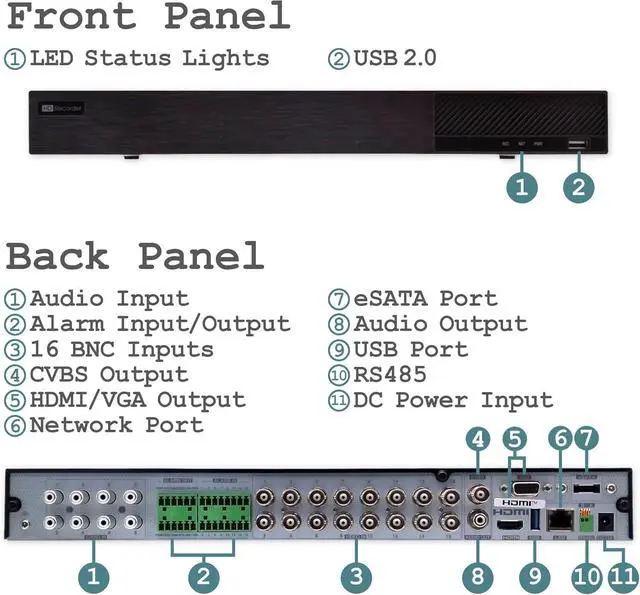 DISPLAY & PLAYBACK: Offers 1080P output via HDMI and VGA ports, with capability to playback 16 channels simultaneously