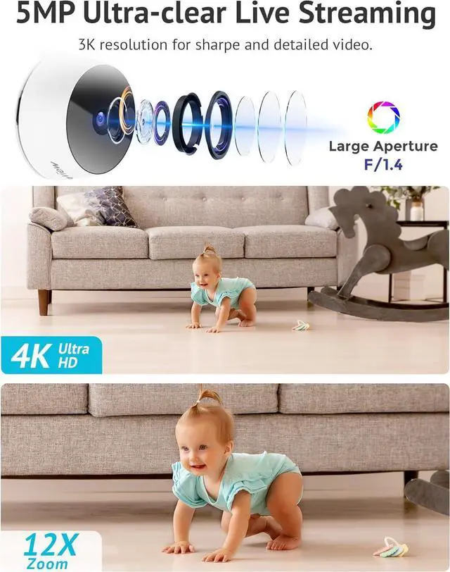 Ultra 5MP 3K Resolution & Night Vision: Experience 3K HD(2880*1616P) clarity with 12x digital zoom; superior to 1080P; indoor cameras offer starlight color night vision without spotlights; no sudden lights to disturb your baby's sleep