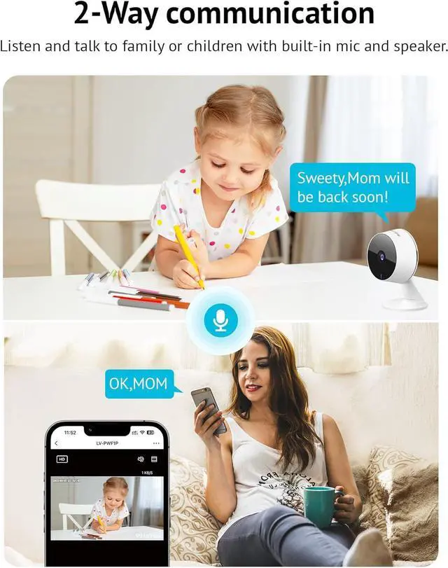 24/7 Real-Time Motion Alert & Clear Two-way audio: Instant motion detection with smart alerts; this indoor home security camera supports clear two-way audio with noise cancellation; stay informed and communicate with family anytime