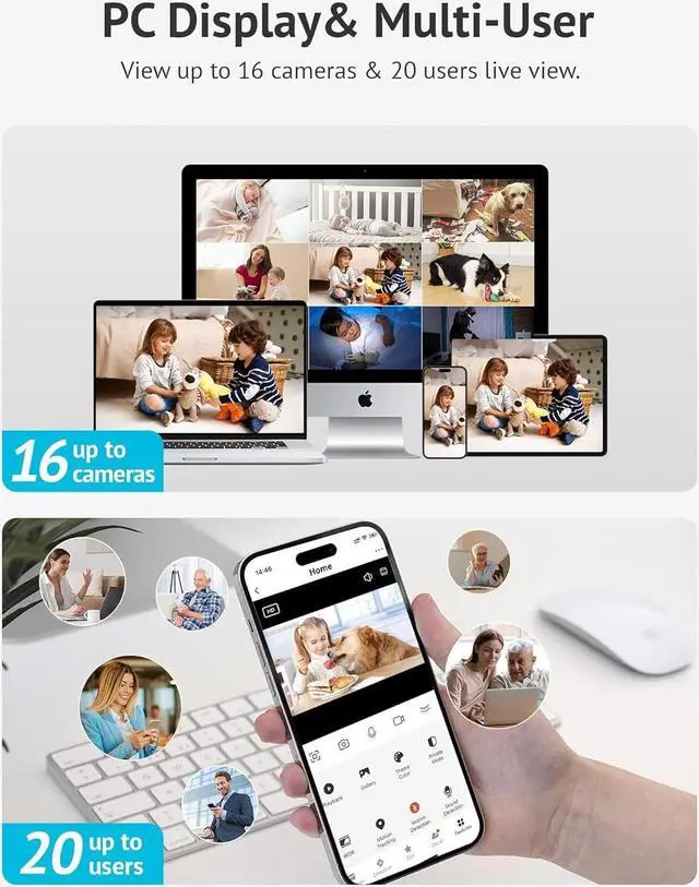 Fit for most scenes & Sharing: The camera can be installed anywhere such as the living room & kitchen & office; space-efficient design; share access with up to 20 people; monitor multiple cameras from a single account