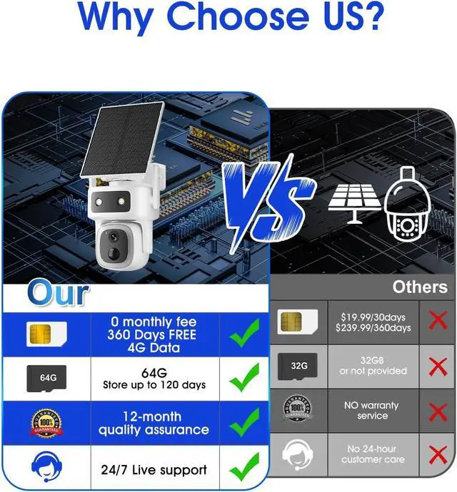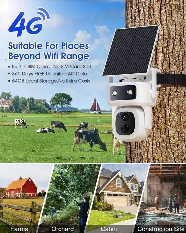 [ 0 Monthly Fees, Lifetime Free Unlimited Data ] The wireless solar-powered outdoor camera is built with a SIM card providing exclusive lifetime free unlimited data. No subscription required, no hidden fees. Lifetime free data. This camera includes a 64GB TF card (supports up to 128GB), capable of recording up to 120 days of video content (based on 0.5GB/day storage) Note: The embedded SIM card cannot be used with other IoT devices. This camera can only be used in areas covered by UK operators. Not currently supported in other regions.