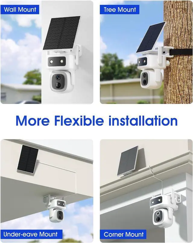[ Durable and Easy to Install ] Durable housing material: ABS; Water resistance rating: IP65; Solar panel output power: 5W. Use the provided hole positioning stickers to mark and drill holes on the wall, secure the base with screws, and then insert the camera to complete the installation.