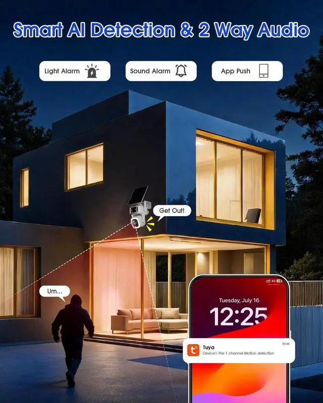 [ AI Motion Detection and Two-Way Audio ] This cellular security wireless camera built-in speaker and microphone system, enabling clear two-way audio communication and real-time dialogue with anyone within the camera's field of view, and is also compatible with Alexa. This camera can quickly and accurately detect any movement of people or animals, then immediately send an alarm notification to your phone (you can adjust the sensitivity of this feature in the Tuya Smart APP), monitor your property remotely.