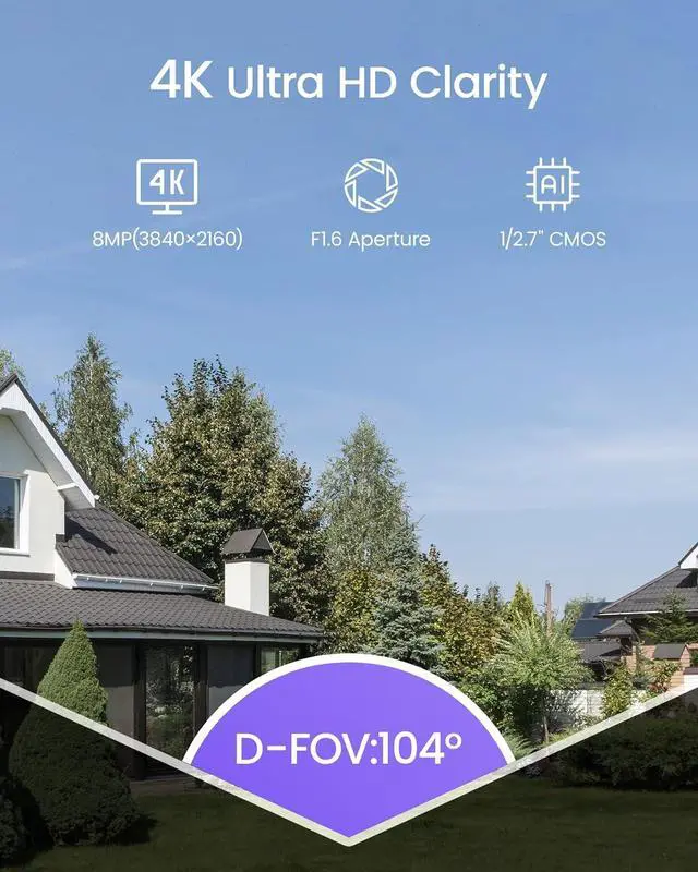 4K Clear Audio and IR Vision - Featuring an F1.6 aperture, the larger lens delivers 8MP ultra-high-definition surveillance video. Equipped with up to 4 infrared lights for illumination, it captures clear footage even in darkness, with a maximum night vision range of 100 feet.
