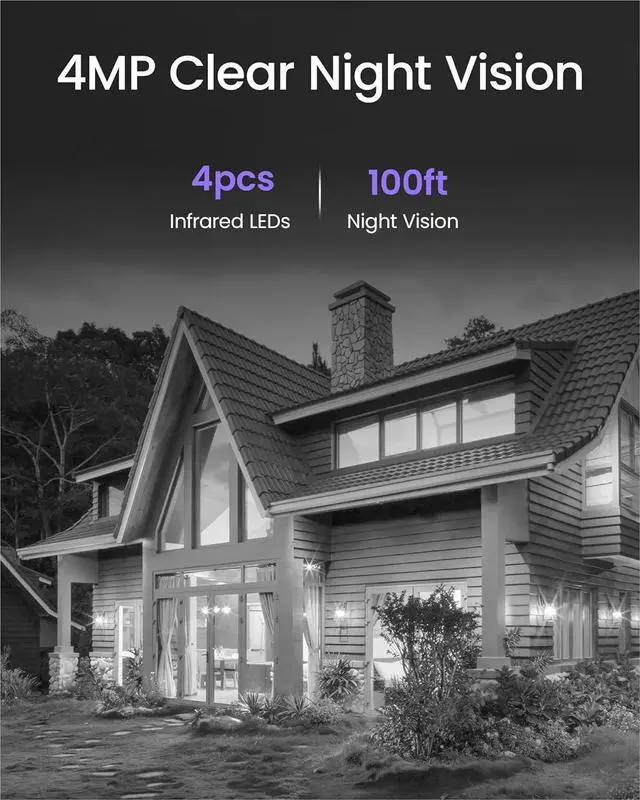 HD Resolution & IR Night Vision - Capture ample light with a 2.0 aperture, delivering 4MP high-definition resolution. Built-in infrared LEDs provide 100ft night vision in complete darkness, while 3D noise reduction technology effectively suppresses graininess to ensure clearer images day or night.