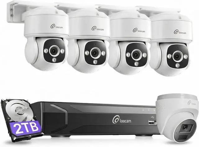 4K PoE Security Camera System & IR Vision - Loocam pan & tilt security camera system equipped with 5 UHD 8MP security cameras and an NVR recorder. Ultra-high-resolution recording combined with 3D digital noise reduction optimizes image quality to the utmost. Provides 24/7 round-the-clock monitoring, featuring 3 infrared lights for night vision illumination. Captures ultra-high-definition images even in darkness, with a maximum night vision range of 98 feet.