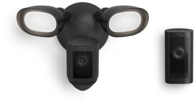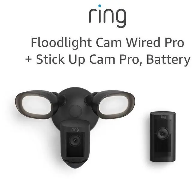 This bundle contains one Ring Floodlight Wired Pro and one Ring Stick Up Cam Pro, Battery.