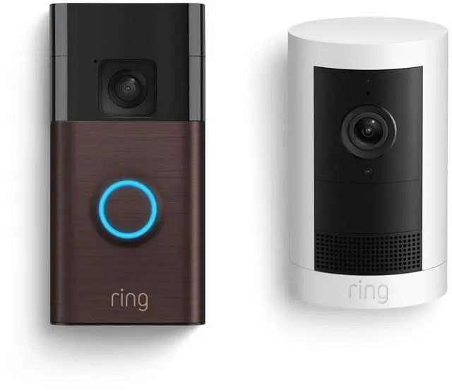 This bundle contains Ring Battery Doorbell (Venetian Bronze) and Ring Outdoor Cam Plus, Battery (White).