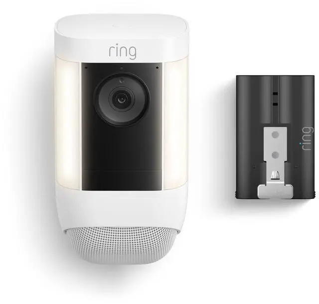 This bundle contains Ring Spotlight Cam Pro, Battery (White) with extra Ring Rechargeable Quick Release Battery Pack.