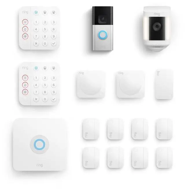 This bundle contains All-new Ring Battery Doorbell Plus with Ring Spotlight Cam Plus, (White) and Ring Alarm 14-Piece (White).