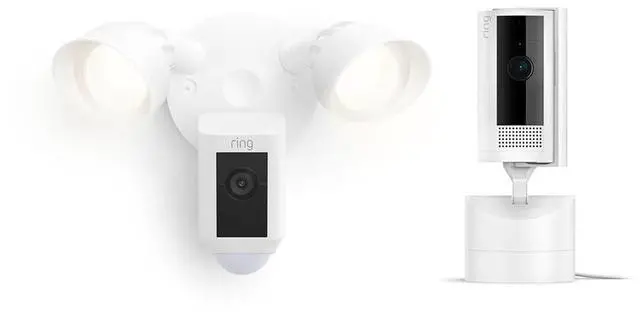 This bundle contains one Ring Pan-Tilt Indoor Cam (White) and one Ring Floodlight Cam Wired Plus (White).