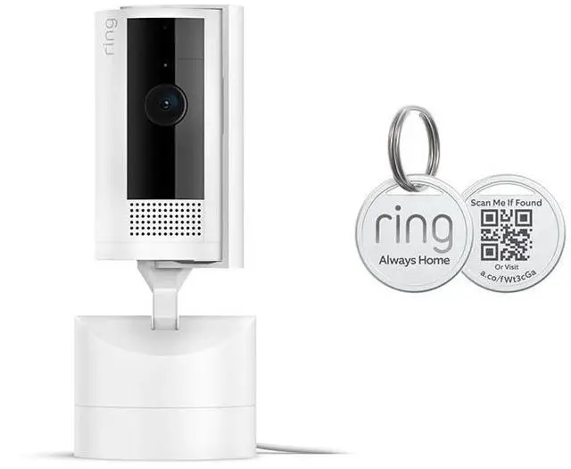This bundle contains one Ring Pan-Tilt Indoor Cam (White) and one Ring Pet Tag.