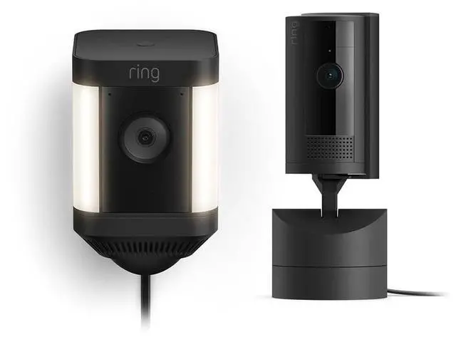 This bundle contains one Ring Pan-Tilt Indoor Cam (Black) and one Ring Spotlight Cam Pro Plug-In (Black).