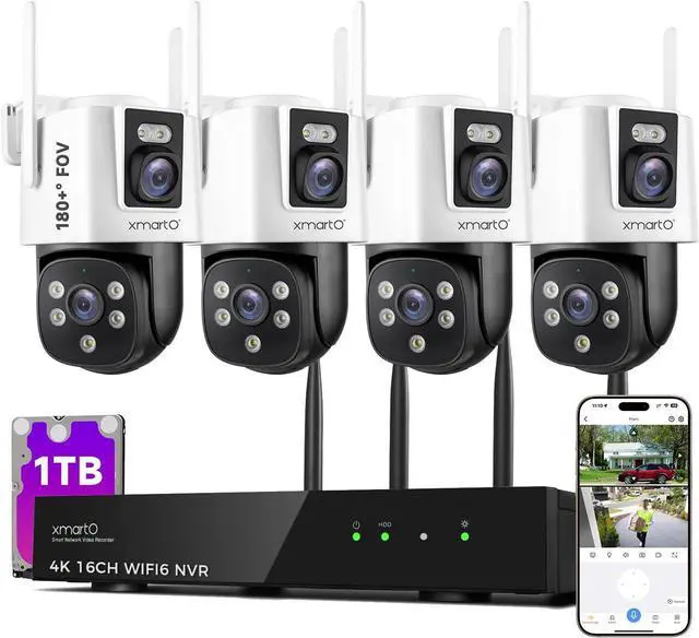 [Dual-Image Wide FOV] XMARTO 16CH Security Camera System Wireless, 4-Set 2-in-1 Cameras, 4K Long Range WiFi 6 Surveillance NVR, Pan Tilt Zoom 4MP QHD Home CCTV Camera Set w. 1TB HDD, 0 Monthly Fee