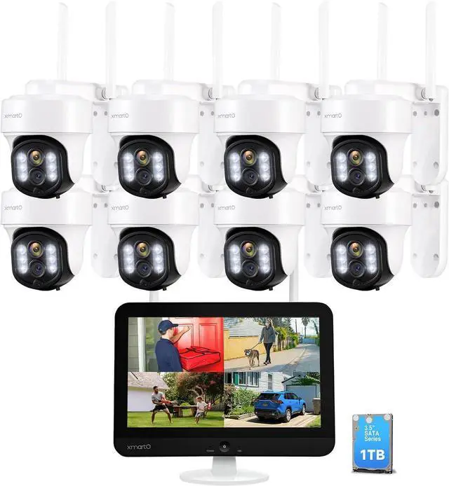 [WiFi 6 LCD NVR] XMARTO 10X Zoom AI Auto Tracking PTZ Home Security Camera System with LCD Monitor NVR/DVR (1TB HDD Storage), with 8X Rotate 6MP Home Cams