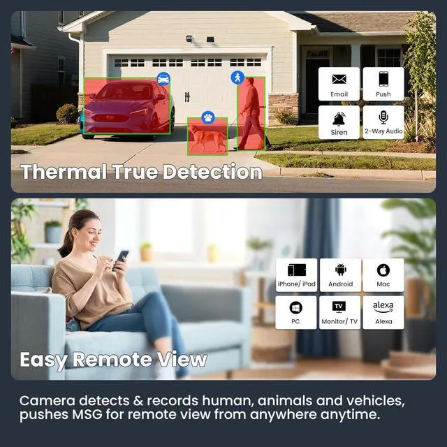 Thermal True Detection - The built-in PIR sensor detects thermal changes and send you instant mobile alerts or emails when people/ animals/ vehicles detected; The thermal true detection reduces most false alerts and improve your home a safer place;