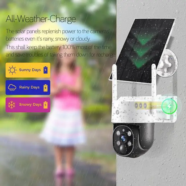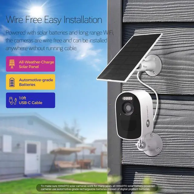 Wire-free Easy-setup Solar CamerasThe cameras are powered with TESLA-type automotive-grade rechargeable batteries and solar panels. It's easy to install the cameras anywhere indoor and outdoor. No cable needed.