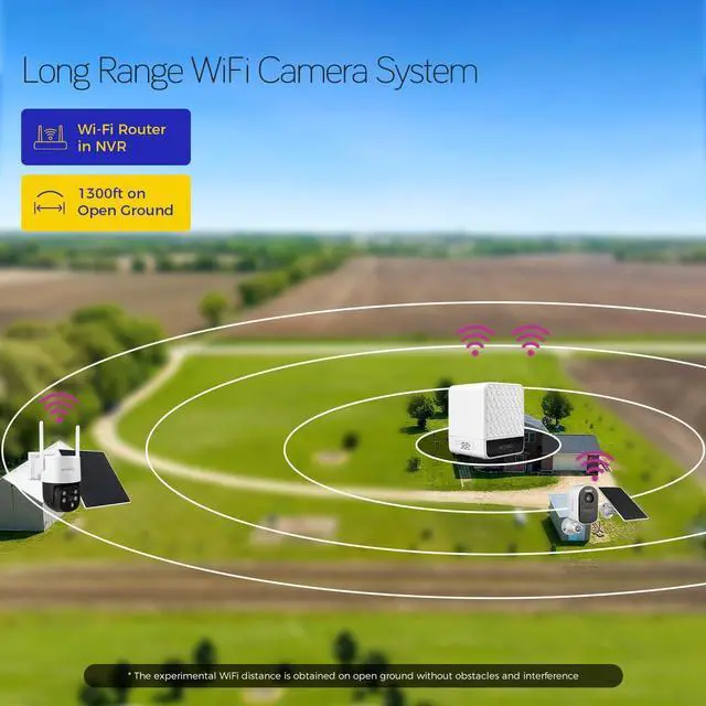 Long Range WiFi 6 ConnectionWith outstanding WiFi 6 technology, on open ground, the XMARTO WiFi cameras work from up to 1300ft (400m) away from the base. In houses with walls & WiFi interferences, the cameras maintain a strong performance and cover a few hundred feet. This gives you a lot of flexibility to use the cameras where you need them.