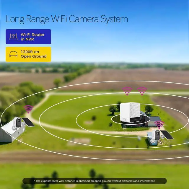 Long Range WiFi 6 ConnectionEvolved to WiFi 6 technology, on open ground, the XMARTO WiFi cameras work from up to 1300ft (400m) away from the base. In houses with walls & WiFi interferences, the cameras maintain a strong performance and cover a few hundred feet.