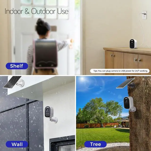 Wire-free Easy-setup Solar CamerasThe cameras are powered with TESLA-type automotive-grade rechargeable batteries and solar panels. You can place the cameras indoor on any surface, or mount them to walls outdoors. No cable needs to be run since they are wire-free.