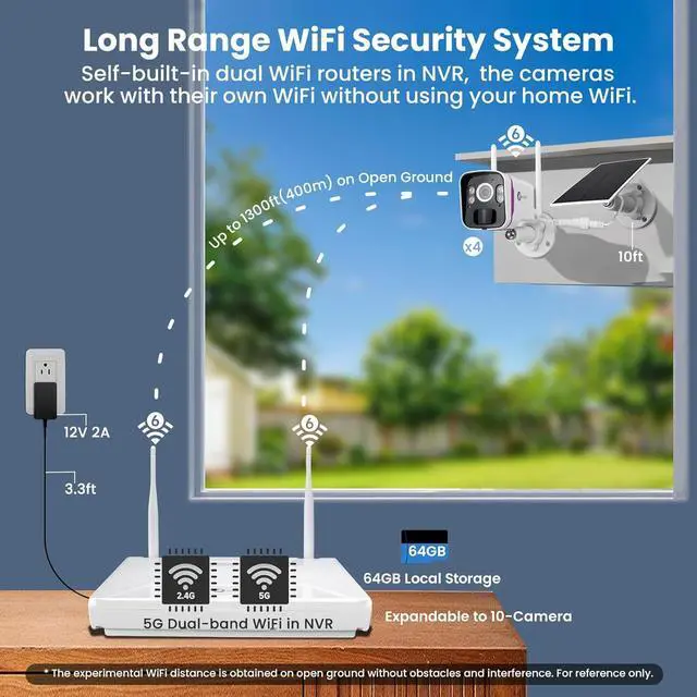 5G Long Range Wi-Fi 6 for Larger Coverage: Cameras for home security while tested on open ground, the outstanding Wi-Fi performance enable the cameras to work well even when they are up to 1300ft (400m) away from the NVR. Though this distance will be weaken by walls, still, the Wi-Fi performance is good enough to cover most kinds of houses, stores or even offices, giving you the flexibility to mount the cameras where you want them.