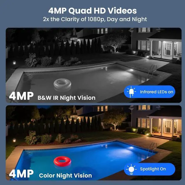 4MP Quad-HD Day & Night Videos: The outdoor camera wireless have 2 times that much pixels of 1080p, captures clear videos day and night. The 4 professional IR + floodlight 2-in-1 LEDs help the cameras to see crystal clear black & white night vision even in pitch darkness (up to 150ft), or capture color night vision with the flood lights on (appr. 20ft). You can easily switch light modes among IR, flood lights and AUTO, right from the phone App.