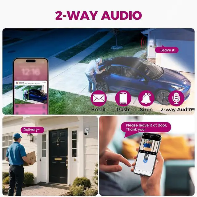 2-Way Audio, Siren & WeatherproofEach cam has mic, speaker & customizable siren for clear 2-way audio & remote deterrence. IP66 resists rain/snow/extreme temps, for indoor/outdoor use. Plug-in power enables 24/7 surveillance, robust multi-point protection.