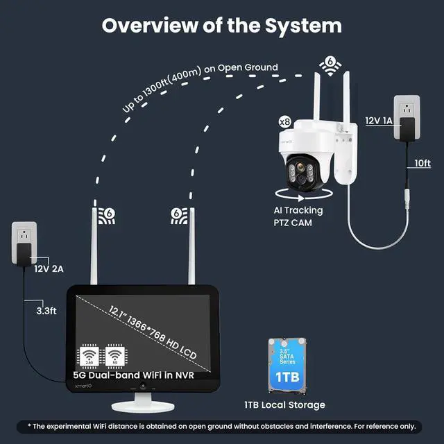 - . | This 8-camera prepackaged kit includes a 10CH 4K dual-WiFi NVR and 8 WiFi PTZ cameras featuring AI auto-tracking and 10X zoom. The NVR has a built-in 12.1 HD LCD screen. On open ground without obstacles, cameras can operate up to 1300ft (400m) away; with household obstacles, they still work reliably from hundreds of feet away.