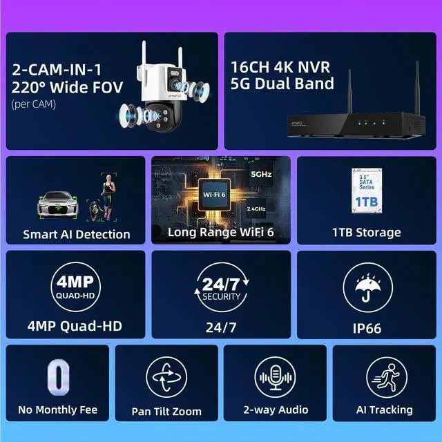 -- - -- This bundle includes a 4-cam prepackaged set with 1TB HDD NVR plus 6 add-on dual-lens cameraspairing the 6 extra cams to the NVR is easy as a breeze, forming a 10-camera surveillance system. It works instantly out of the box: simply plug the NVR into a screen, power on all cameras, and start 24/7 property monitoring right away, with all necessary accessories included.