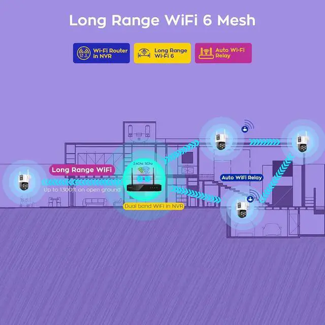 & The 16CH 4K NVR has a built-in professional WiFi6 router, creating a self-built mesh network for all cameras that brings 0 load to your home WiFi and works normally even without an Internet connection. Far cameras with weak signals use closer ones as WiFi repeaters to boost connectivity; (), cameras can be installed up to 1300ft (400m) from the NVR for flexible wireless mounting.