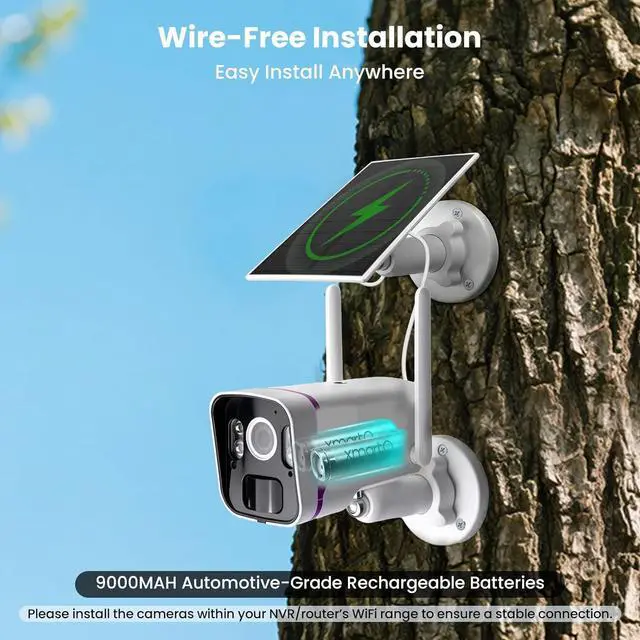 - - Equipped with 9000mAh automotive-grade rechargeable batteries and all-weather solar charging tech. Solar panels replenish power daily (sun/rain/snow) for non-stop winter operation, no need to remove cameras for recharging; also supports 5V USB charging for 24/7 wired monitoring to protect your property and loved ones.