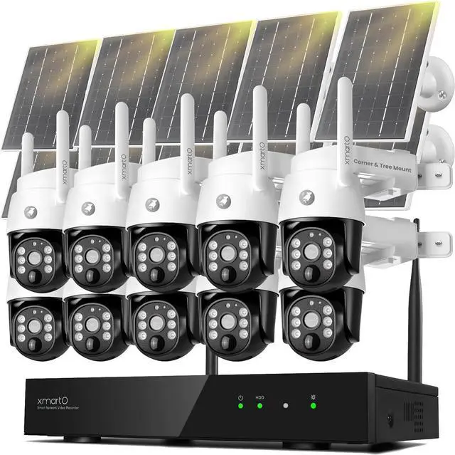 10CH WiFi6 NVR + 10x4MP Solar PTZ Cam Bundle | 1300ft Long Range All-in-one surveillance bundle with 1×WNP810-W6 10CH 4K WiFi6 NVR + 10×SDK4034 4MP solar battery PTZ cams; one-click pairing via NVR menu, 1300ft (400m) stable line-of-sight connection. Simultaneously monitor 10 live feeds on NVRs HDMI screen or remotely via smartphone.