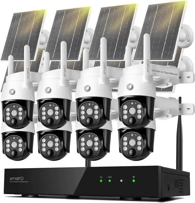 10CH WiFi6 NVR + 8x4MP Solar PTZ Cam Bundle | 1300ft Long Range All-in-one surveillance bundle with 1×WNP810-W6 10CH 4K WiFi6 NVR + 8×SDK4034 4MP solar battery PTZ cams; one-click pairing via NVR menu, 1300ft (400m) stable line-of-sight connection. Simultaneously monitor 8 live feeds on NVRs HDMI screen or remotely via smartphone.