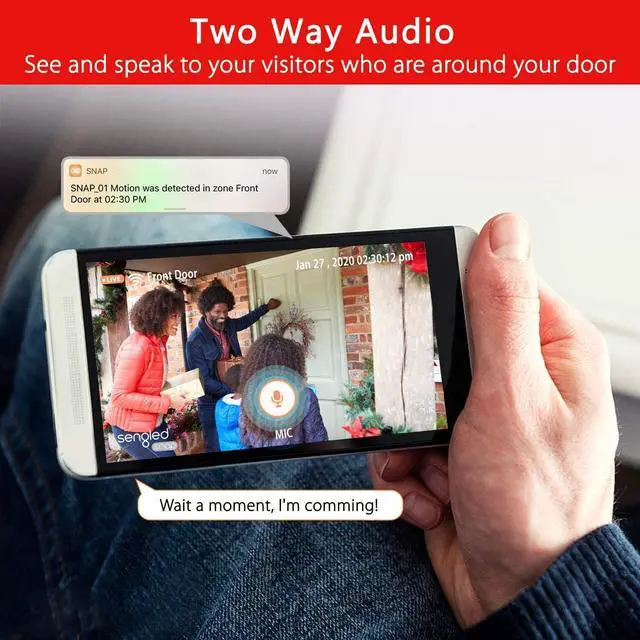 TWO-WAY TALK-Sengled floodlight security camera built in speaker and microphone, you can hear and speak to people on your property from your mobile device directly even when you are far away from home.