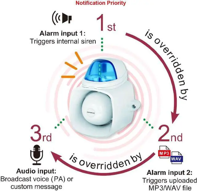 Works as a siren or strobe and can playback audio or broadcast messages 115dB warble-tone siren with 20W speaker IP65 rated, weatherproof design for indoor/outdoor use Two inputs to sound an alarm or to broadcast messages Built-in tamper alarm output