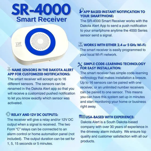 APP-BASED SMARTPHONE ALERTS The SR-4000 Smart Receiver sends instant push notifications to the Dakota Alert smartphone app whenever a paired 4000 Series sensor is triggered. Receive real-time alerts on your phone anytime activity is detected at your property.