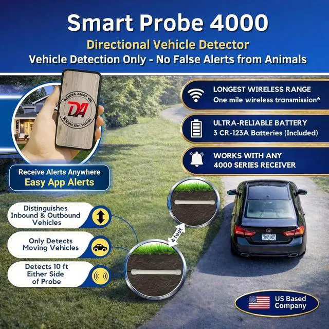DUAL PROBE DRIVEWAY ALARM WITH DIRECTIONAL VEHICLE DETECTION The Dakota Alert DUAL Probe 4000 detects vehicles using advanced magnetic probe technology that senses moving metal. The dual-probe design allows the system to determine whether a vehicle is entering or leaving your driveway, eliminating false alerts from deer or other animals.