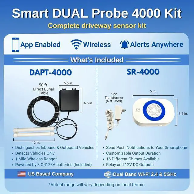INDUSTRY LEADING 1-MILE WIRELESS RANGE* The DUAL Probe 4000 features the longest wireless range in its class, transmitting signals up to one mile* from the sensor to the receiver. This extended range ensures reliable performance even on large properties where other driveway alarms fail. *Range will vary depending on terrain.