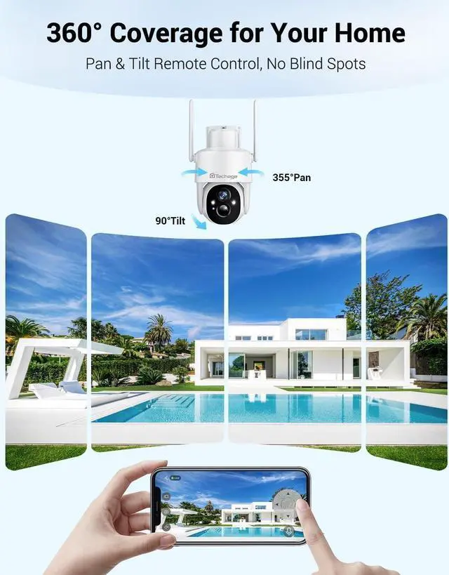 360 COVERAGE & MOTION DETECTION - The Techage PTZ security cameras wireless outdoor supports 355° horizontal and 90° vertical rotation, as well as 4x digital zoom and a coverage distance of up to 33 feet. It can capture every corner of your home through the VicoHome app. This outdoor camera wireless supports human motion detection, motion-activated lights and audible alarms will repel suspicious people, and you can also find out what's going on through notifications from the Vicohome.