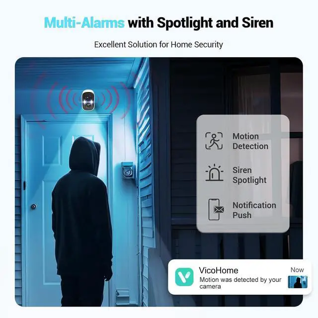 Smart Motion Detection & Instant Alerts Equipped with advanced motion detection, this wireless camera for home security instantly identifies human movement and sends real-time alerts via the Vicohome app. The built-in spotlight and siren activate automatically to deter intruders, giving you instant control and peace of mindno matter where you are.
