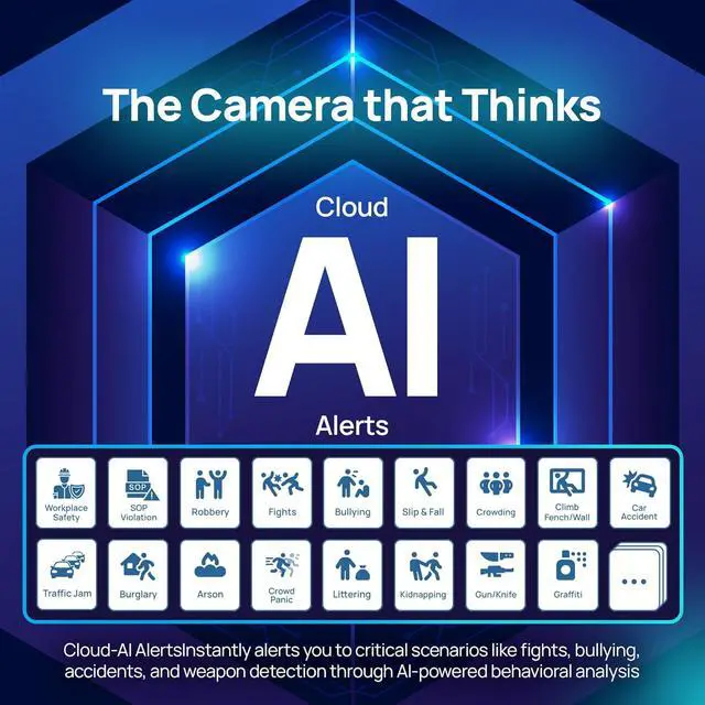 [AI Analytics & Instant Alerts] The advanced AI Cloud Analytics system provides real-time multimodal analysis to detect and identify complex behaviors. Get instant Cloud-AI alerts for critical events like fights, accidents, or suspicious activity, so you can respond quickly.