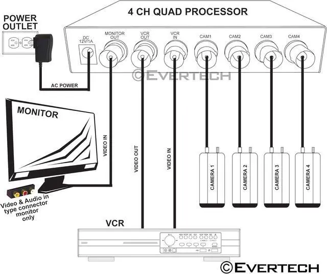 This is 4 Channel Digital Color Quad Processor with Remote Control and a standard 12V DC power supply adapter. It is useful in video surveillance systems that have complex monitor display requirements. Great for those who only wants to view their camera and do not need to record.