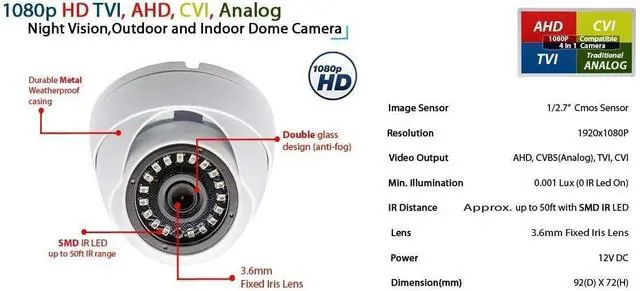 3.6mm Wide Angle Fixed Iris Lens provides approximately 114° angle of view. Powerful new style SMD IR LED for up to 50ft night vision.