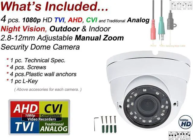 It is compatible with 1080p AHD/TVI/CVI/Analog Digital Video Recorders. Factory Default Video Mode is AHD. Video mode must be switched according your DVR type. It is very easy to do with DIP switch.