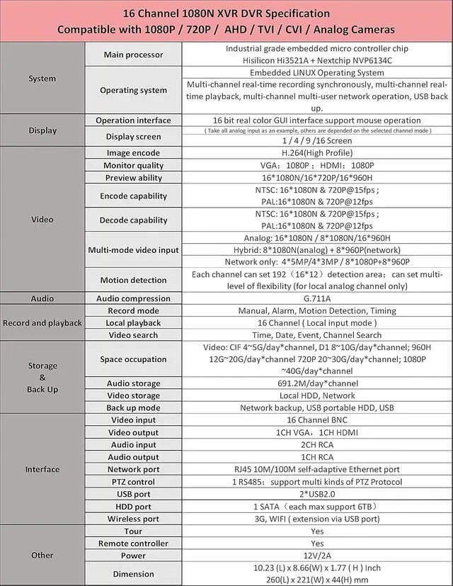Compatible with all 1080P, 960P, 720P ,TVI, AHD, CVI and Traditional Analog Cameras. Not Compatible with HD-SDI and over 2.4mp cameras. 1TB Hard Drive memory storage is installed for recording.