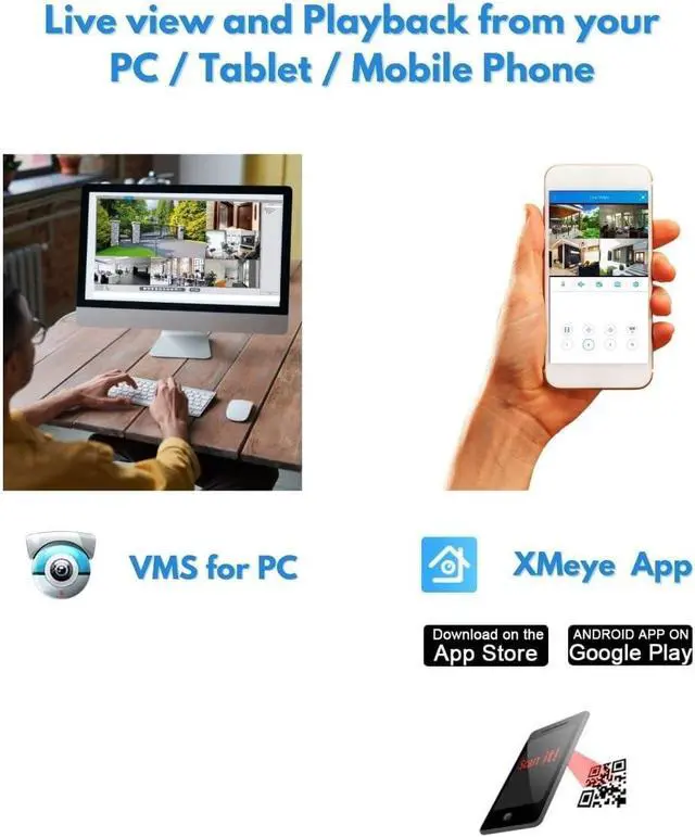 View live and recorded video on multiple devices, such as smartphone, tablet or PC. With the free Application, you can view your system on iOS/Android phone and you can also use a web browser or CMS Client Software on your PC to access your security cameras.