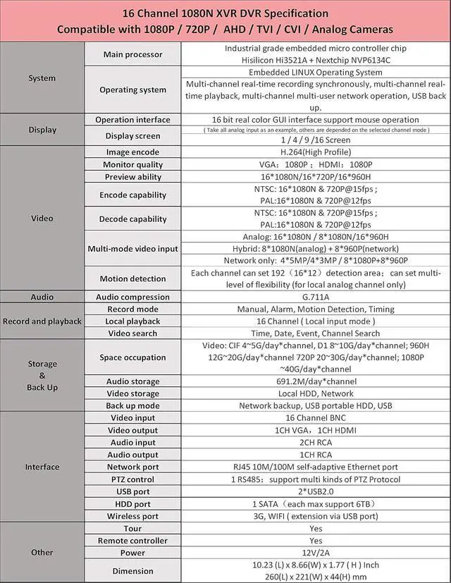 This hybrid video recorder is compatible with 4 types of security cameras: (1080p/960p/720p) TVI, AHD, CVI, and Traditional analog cameras. It supports up to 1080P high clarity video recording.