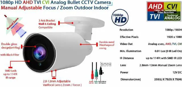 Powerful IR LEDs provides sharp and clear image at night at the distance of up to 114ft. 2.8-12mm Lens, Zoom and Focus can be adjusted manually.